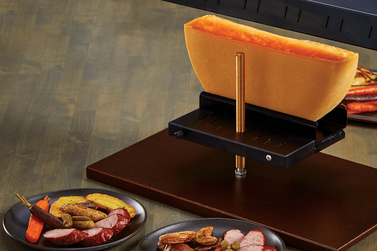 Classic raclette cheese is made from cow’s milk and hails from the Alpine regions of Switzerland and France. It’s known for its smooth melt, nutty flavor, and buttery finish. Other cheeses commonly used for raclette include Alpine-style cheeses like gruyère, emmental, and fontina. In Wisconsin, raclette-style cheeses such as Roth Grand Cru or Wood River Creamery’s Cheddar Gruyère also make exceptional choices.